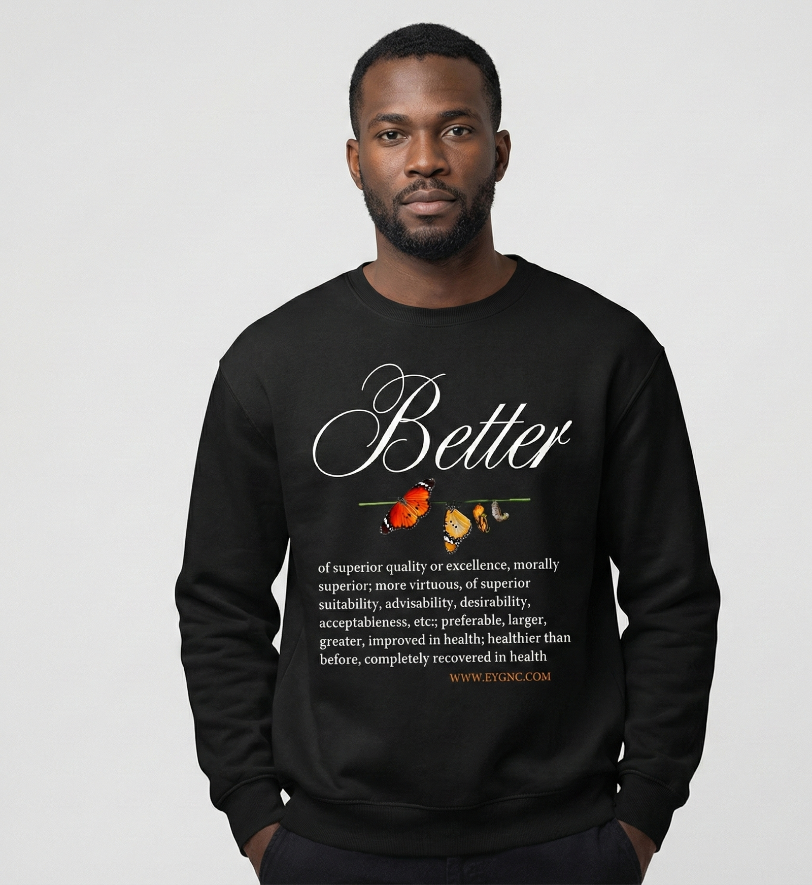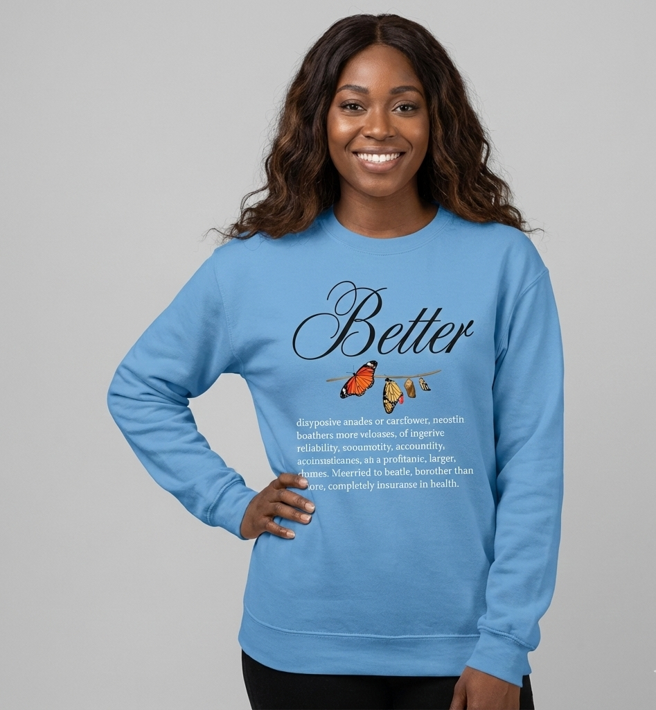 The Better Sweatshirt is designed to remind, inspire, and motivate you to keep pursuing your dreams and goals. Better represents growth, improvement, and striving for excellence in every area of life—spiritually, mentally, and personally.